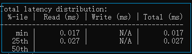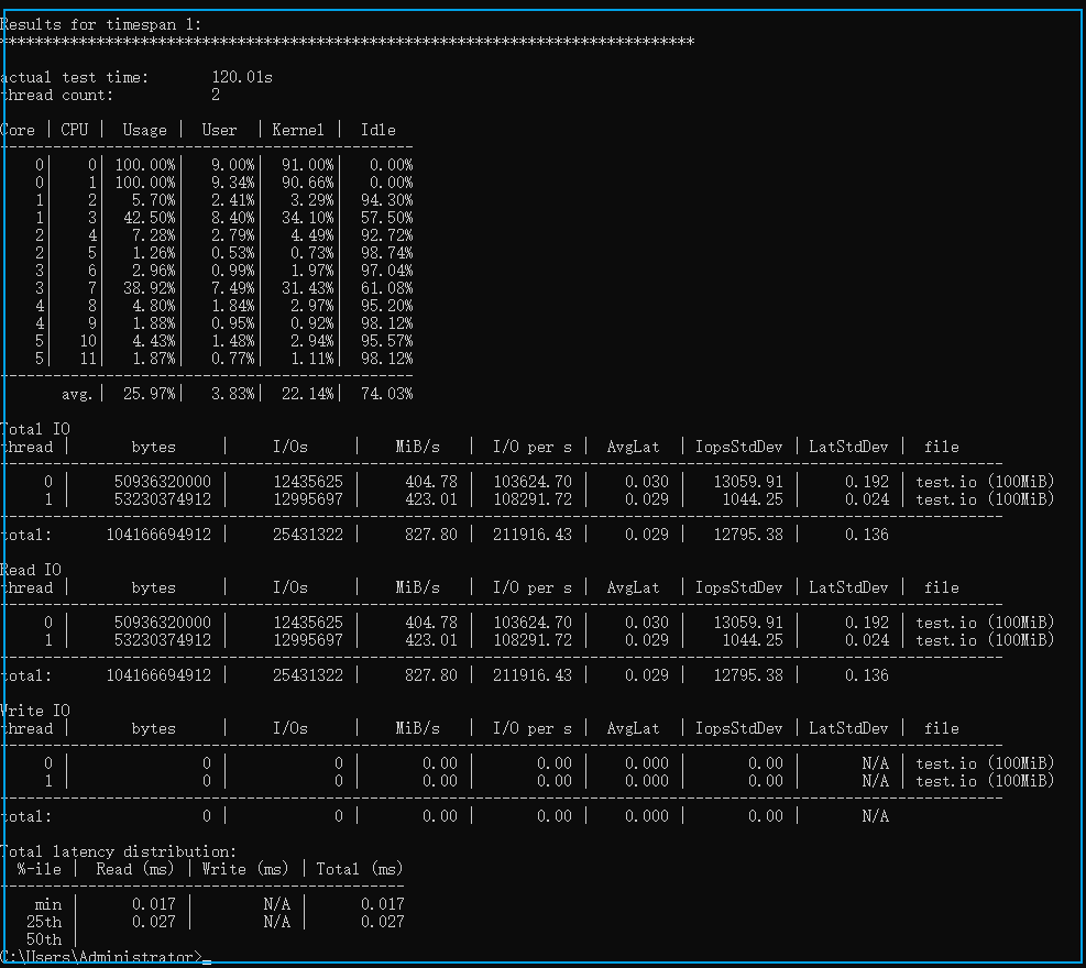以上例子对 C 盘下的 test.io 文件进行测试,起了两个测试线程,文件大小为 100M ,测试时间为 120s,最终测试报告如下:两个线程,每个IO吞吐量为400MB/s,一共800MB/s,IOPS为 200000,延迟为 0.027 msdiskspd 的参数比较多,通过 diskspd /? 可以查看帮助文档。以上例子中用的的参数有:-t2:这表示每个目标/测试文件的线程数。此数字通常基于 CPU 核心数。在本例中,使用两个线程来对所有 CPU 核心施加压力。-o32:这表示每个目标每个线程的未完成 I/O 请求数。这也称为队列深度,在本例中,使用 32 来强调 CPU。-b4K:这表示块大小(以字节、KiB、MiB 或 GiB 为单位)。在本例中,使用 4K 块大小来模拟随机 I/O 测试。-r4K:这表示随机 I/O 与指定大小(以字节、KiB、MiB、Gib 或块为单位)对齐(覆盖-s参数)。使用常见的 4K 字节大小与块大小正确对齐。-w0:指定写入请求操作的百分比(-w0 相当于 100% 读取)。在本例中,0% 写入用于进行简单测试。-d120:这指定了测试的持续时间,不包括冷却或预热时间。默认值为 10 秒,但我们建议对于任何严重的工作负载至少使用 60 秒。在本例中,使用了 120 秒来尽量减少任何异常值。-Suw:禁用软件和硬件写入缓存(相当于-Sh)。-D:以毫秒为间隔捕获 IOPS 统计数据,例如标准偏差(每个线程、每个目标)。-L:测量延迟统计数据。-c100M:设置测试中使用的样本文件大小。可以以字节、KiB、MiB、GiB 或块为单位进行设置。在本例中,使用了 100M 的目标文件。