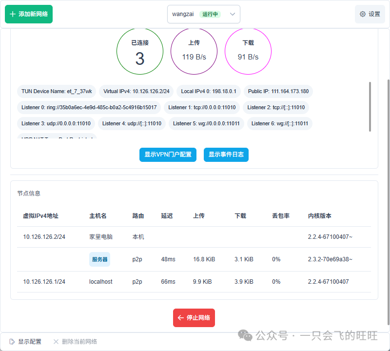那么,欢迎来到Easytier的精髓所在:自建高可用、去中心化的“根”节点网络。 官方提供了一些共享节点,地址 : https://easytier.gd.nkbpal.cn/status/easytier 同样的,如果你有云服务器,也可以选择自建节点,执行下面两个命令 然后一个自用的服务器,就搭建好了,只需要在GUI界面调整为自己服务器的IP,端口默认是11010,如下图.
