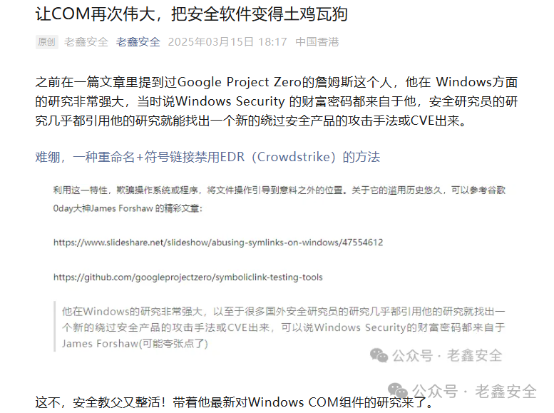 符号链接在 Windows 系统中的存在,几乎与系统自身的历史一样悠久。而基于符号链接的漏洞利用技术,也早已不是新鲜事物——早在 1999 年,安全研究员大佬 James Forshaw 就在其分享中首次系统性地揭示了这一攻击思路(参见:https://www.slideshare.net/slideshow/abusing-symlinks-on-windows/47554612#34)。