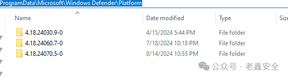 每当有新版本更新时,WinDefend服务都会创建一个以新下载的版本命名的新文件夹,并将其放置在“ C:\ProgramData\Microsoft\Windows Defender\Platform ”文件夹中。新文件夹包含新版WinDefender的所有可执行文件。