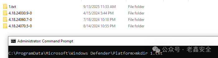 So,结合之前Windows Defender 如何过渡到新版本的信息,如果在“Platform”中创建一个以最高版本号命名的文件夹,Defender 会将这个文件夹用作其执行文件夹