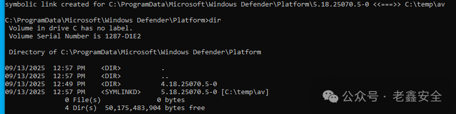 mklink /D "C:\ProgramData\Microsoft\Windows Defender\Platform\5.18.25070.5-0" "C:\temp\av"
