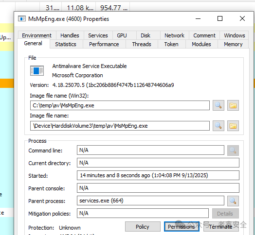 如图所见,Defender 现在使用位于“C:\temp\av”的可执行文件。在此文件夹中,我们可以完全控制执行诸如写入/删除文件之类的操作。还可以使用 DLL 侧加载技术将代码注入Defender进程以利用他的权限干坏事。