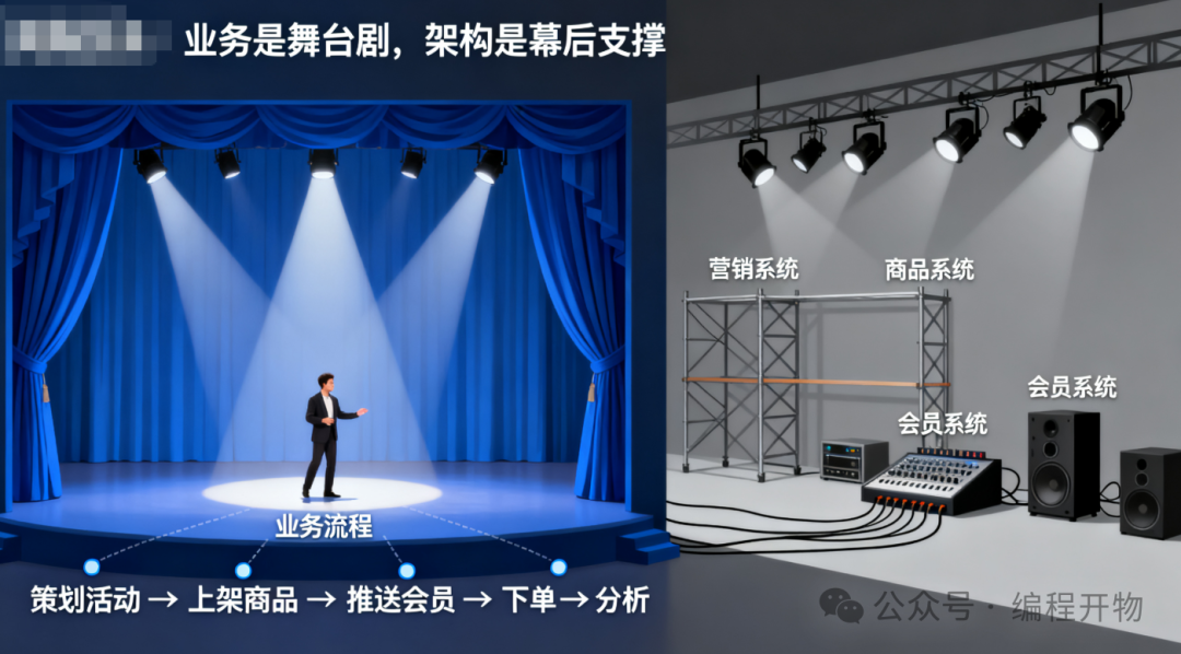 换句话说:业务是舞台剧,架构是幕后灯光、布景和音响