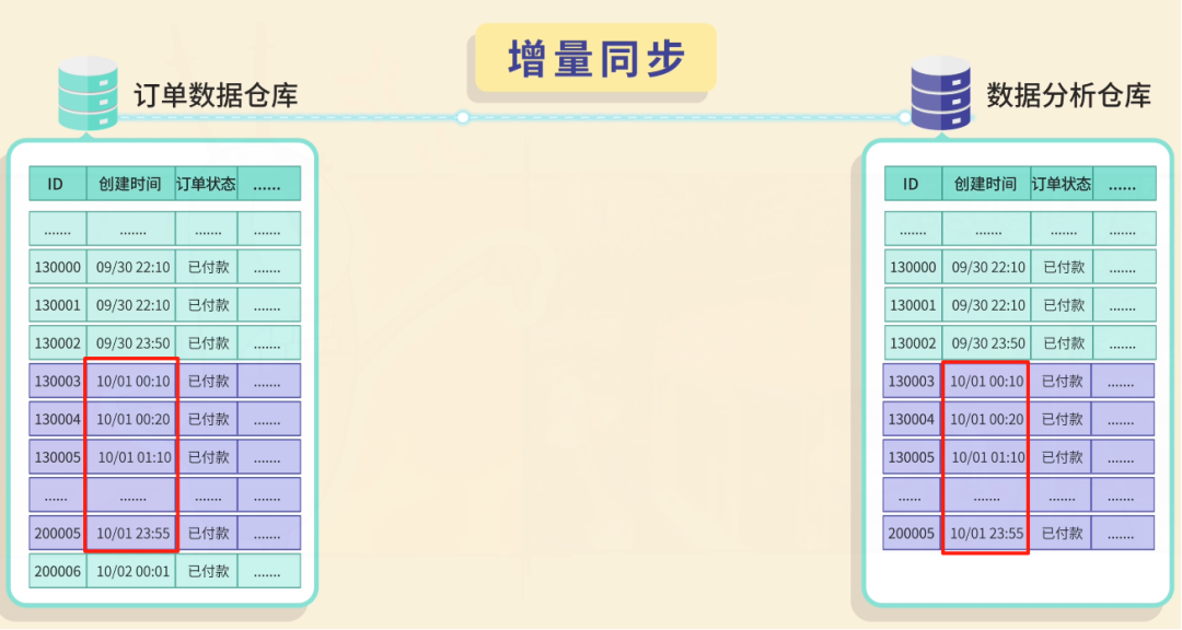 这就是 增量同步,约定每天 0 点执行同步任务,只同步昨天 0 点之后创建的订单。