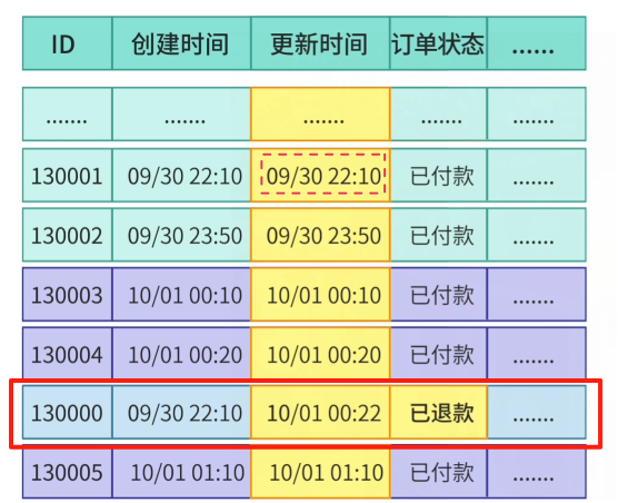 可就在查询下一页前,订单 B 因为 “修改订单状态” 被更新,这时订单 B 的更新时间就不在查询范围内了。