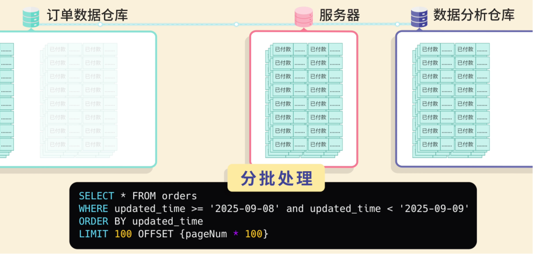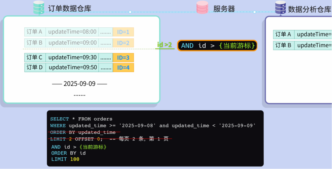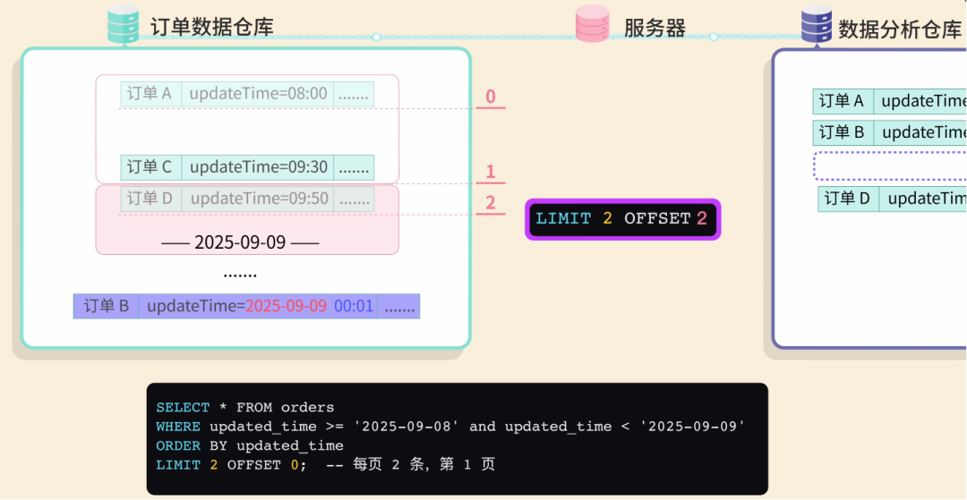 查询结果返回订单 A(08:00)和订单 B(09:00),同步完成后将偏移量调整为下一页 OFFSET=2