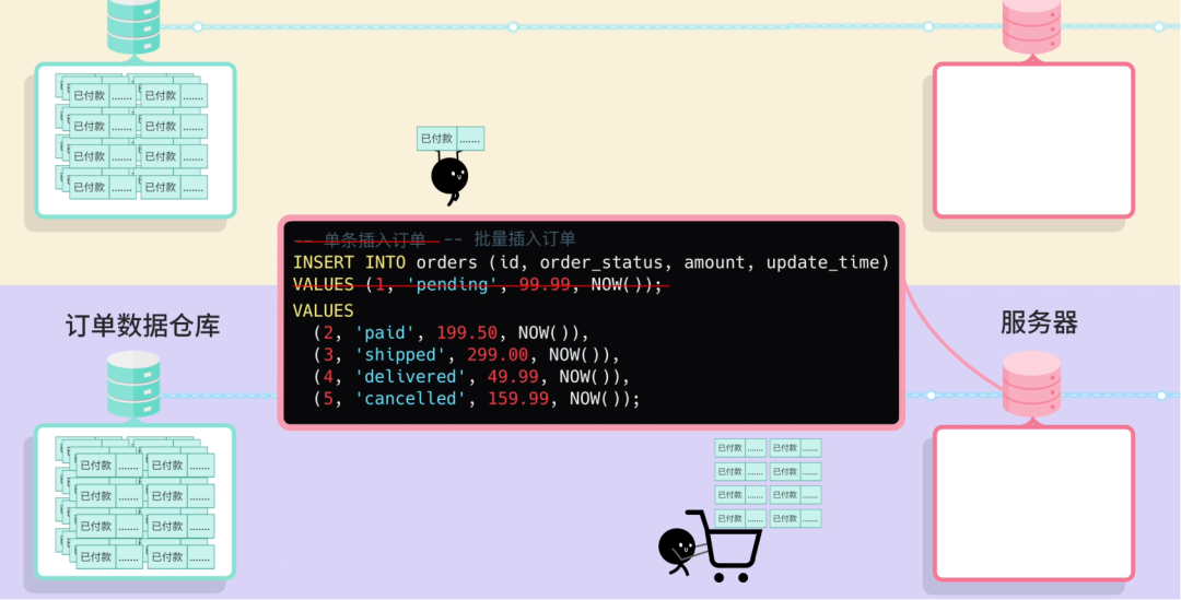 首先,修改插入数据库的操作方式。之前是一条一条地插入订单数据,改为执行一条批处理语句来同时插入同一批内多个订单数据,减少了跟数据库通信的次数,性能大幅提升。