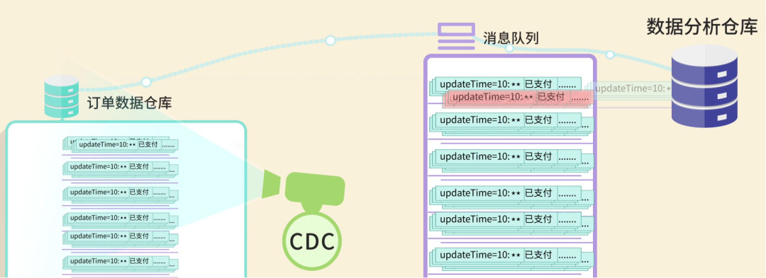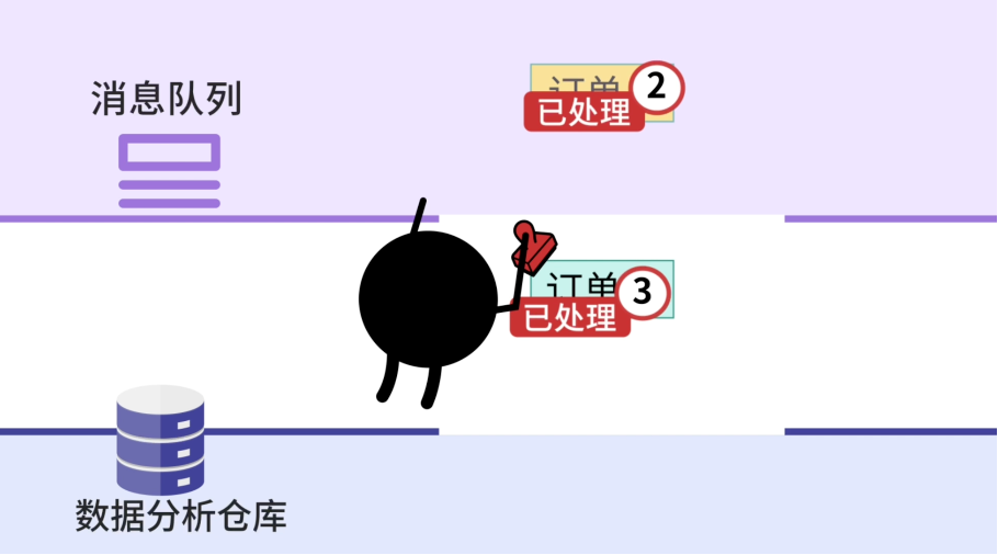 消息队列就像一个快递中转站。数据库变化的消息先发送到这个中转站,然后同步数据的程序从中转站取出数据并写入到数据分析仓库中。