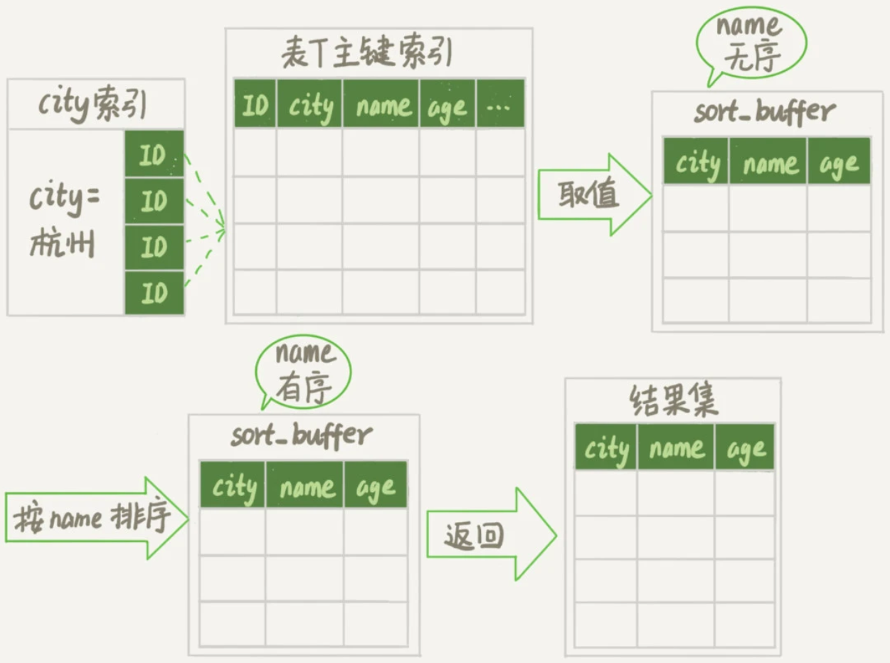 为了更好地分析,这里引用上一篇文章中全字段排序和rowid排序的流程图: