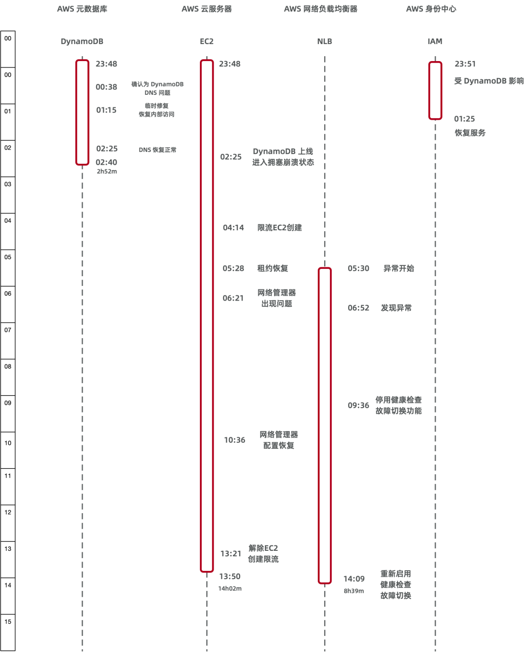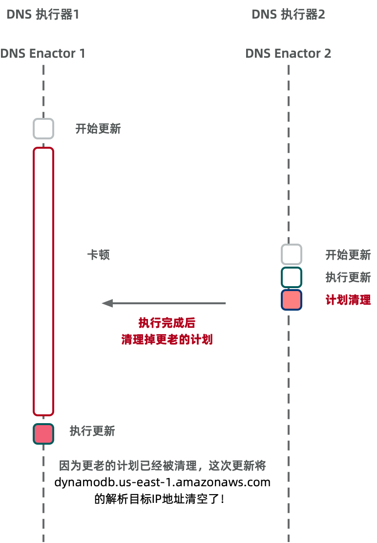 今天 AWS 官方发布了 10-20 日美东大故障 的事后复盘报告,细节比较丰富,算是少有的第一手资料。所以老冯把它翻译成了中文,并附上解读与评论,供大家参考。  Amazon DynamoDB 服务中断总结我们希望就2025年10月19日至20日发生在美国东部弗吉尼亚北部(us-east-1)区域的服务中断事件向您提供一些补充信息。此次事件始于10月19日 PDT23:48,结束于10月20日 PDT14:20。在此过程中,客户应用的影响大致可分为三个不同阶段: 首先,10月19日23:48至10月20日02:40,Amazon DynamoDB 在美国东部(弗吉尼亚北部,us-east-1)区域的 API 错误率显著升高。 其次,10月20日05:30至14:09,网络负载均衡器(Network Load Balancer,NLB)在该区域出现部分负载均衡实例连接错误率上升的情况(源于 NLB 集群的健康检查失败)。 第三,10月20日02:25至10:36,新的 EC2 实例启动均告失败;尽管从10:37开始实例启动逐步恢复成功,但部分新启动实例出现了网络连接问题,直到13:50才完全解决。  DynamoDB2025年10月19日23:48 至 10月20日02:40期间,美国东部(弗吉尼亚北部,us-east-1)区域的 Amazon DynamoDB API 错误率显著升高。在此期间,所有依赖 DynamoDB 的客户应用和其他 AWS 服务都无法与该服务建立新的连接。此次故障由 DynamoDB 服务的自动化 DNS 管理系统中的一个潜在缺陷所触发,该缺陷导致 DynamoDB 服务端点的 IP 地址解析失败。 AWS 许多大型服务都高度依赖 DNS 来实现无缝扩展、故障隔离与恢复、低延迟以及数据就近访问。例如,DynamoDB 在每个区域维护着数十万条 DNS 记录,以管理该区域内庞大且异构的负载均衡集群。通过自动化频繁更新这些 DNS 记录,可以在新扩容资源上线时立即添加对应记录,正确应对硬件故障,并高效地分配流量,优化客户体验。该自动化系统针对高弹性进行设计,使服务能够从各种运行问题中快速恢复。除了提供公共区域端点以外,该系统还维护了多个 DynamoDB 的动态 DNS 端点,包括符合 FIPS 标准的专用端点、IPv6 专用端点,以及账号级别的专属端点。 此次问题的根本原因在于 DynamoDB DNS 管理系统中存在一个潜伏的竞态条件(race condition)。该竞态问题导致服务的区域端点 (dynamodb.us-east-1.amazonaws.com) 的 DNS 记录被错误地清空,而自动化系统未能及时纠正这一状况。为解释这一情况,我们需要先介绍 DynamoDB DNS 管理系统的架构。出于高可用性的考虑,该系统分为两个相互独立的组件: •DNS 规划器(DNS Planner):监控负载均衡器的运行状况和容量,并定期为服务的每个端点创建新的 DNS “方案”(plan),其中包含一组负载均衡器及其权重。我们为整个区域生成统一的 DNS 方案,因为当多个端点共享资源容量时(例如公共区域端点和新推出的 IPv6 端点),统一的方案极大地简化了容量管理和故障处理。•DNS 执行器(DNS Enactor):被设计为几乎无依赖,以便在任何场景下都能独立运行恢复。DNS 执行器负责将 DNS 方案应用到 Amazon Route 53 服务中。为增强弹性,我们在三个不同的可用区(AZ)中各部署了一个完全独立运行的 DNS 执行器实例。每个 DNS 执行器都会监听新的方案生成,并通过 Route 53 事务尝试将当前方案替换为新方案。这种机制可确保即使有多个 DNS 执行器并发地更新同一端点,也能让该端点应用一致的方案。 此次竞态条件源于两个 DNS 执行器之间一次极为罕见的交互。正常情况下,DNS 执行器获取最新方案后,会依次将其应用到服务的各个端点上。这个过程通常非常迅速,能够确保 DNS 状态保持最新。在开始应用新方案之前,DNS 执行器会一次性检查其即将应用的方案是否比之前的方案更新。在遍历端点列表应用方案的过程中,如果某个 DNS 执行器在更新某端点时被另一执行器暂时阻塞,它将反复重试直到成功。 在本次事件发生前夕,一台 DNS 执行器在更新多个端点时遭遇了异常高的延迟,不得不对几个 DNS 端点进行了多次重试。当它以缓慢的速度逐步处理这些端点时,又发生了几件事:首先,DNS 规划器继续运行并生成了多代更新的方案;其次,另一台 DNS 执行器开始应用其中一个较新的方案,并快速地完成了对所有端点的更新。这一系列操作在时间上的巧合触发了那个潜伏的竞态条件。 当第二台(较快的)DNS 执行器完成端点更新后,它启动了方案清理进程,该进程会删除所有比刚应用方案“陈旧得多”的旧方案。恰在此时,第一台(较慢的)DNS 执行器终于将其早已过期的方案应用到了 DynamoDB 的区域主端点,结果把较新的方案覆盖掉了。由于该执行器在开始应用时所做的新旧方案校验因长时间延迟而变得过期无效,所以未能阻止旧方案覆盖新方案。随后,第二台执行器的清理进程检测到这个过期方案(相对于它刚应用的方案已过多代),便将其删除。随着这一方案被删除,该区域端点的所有 IP 地址也从 DNS 记录中被移除了。而且由于活动方案被移除,系统陷入不一致状态,导致之后无论哪台 DNS 执行器都无法再成功应用新的方案。最终,我们不得不通过人工干预来纠正这一状况。  当上述故障于 PDT 时间10月19日23:48 出现后,所有通过公共端点连接美国东部(弗吉尼亚北部,us-east-1)区域 DynamoDB 服务的系统立刻遭遇 DNS 解析失败,无法连接至 DynamoDB。这不仅影响了客户流量,也影响了依赖 DynamoDB 的 AWS 内部服务流量。启用了 DynamoDB 全局表(Global Tables)的客户虽然能够对其他区域的副本表成功发出请求,但与 us-east-1 区域对应副本之间出现了严重的复制延迟。相关 AWS 服