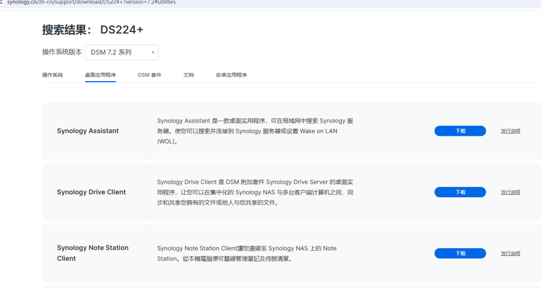 我们不需要下载这个DSM7.2.2操作系统到电脑,我们直接,选择桌面应用程序。找到Synology Assistant群辉助手软件。