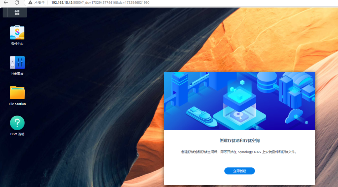 登录到系统界面之后,我们还需要对硬盘进行初始化,创建存储池和存储空间,点击立即创建。
