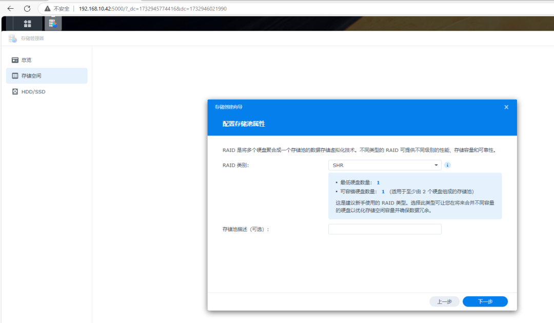 RAID模式选择,如果选择的是SHR,一般新手就可以选择SHR,当NAS里面只有一颗硬盘的时候,磁盘阵列的模式为basic,无数据保护。当再添加为一个硬盘的时候磁盘阵列的模式自动转换成类似raid1模式,空间大小不变,但是多了个数据保护。当再加入一个硬盘的时候会自动转换成类似raid5模式,当然了,你的NAS也要有支持3个盘位。