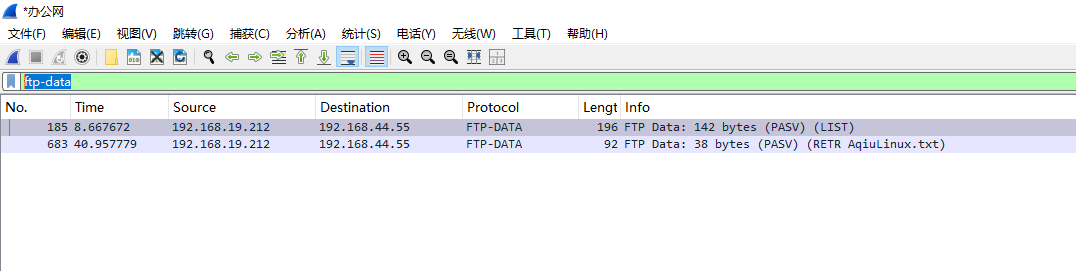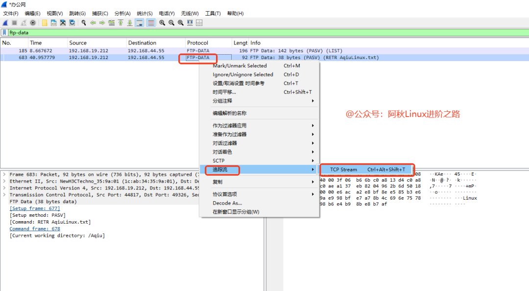 在 Wireshark 的显示过滤器栏中,输入ftp-data 并回车。会看到一系列数据包,协议显示为 FTP-DATA。这些包里面就承载着实际的文件内容。右键单击任意一个 FTP-DATA 数据包 -> Follow -> TCP Stream。
