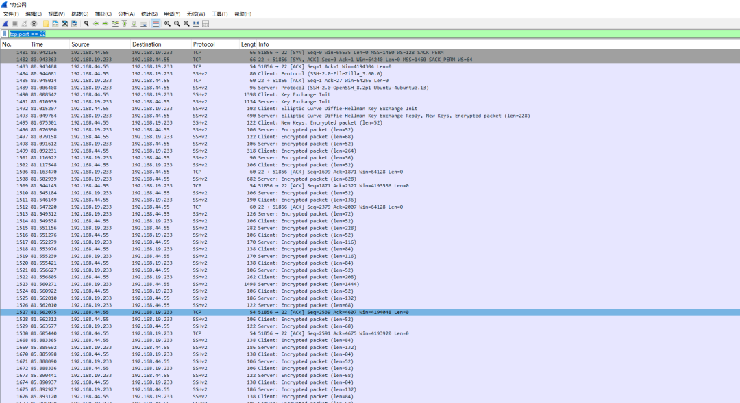 1.跟抓FTP包过程一样,做相关操作后停止抓包后。经tcp.port == 22 过滤,得到如下数据包: