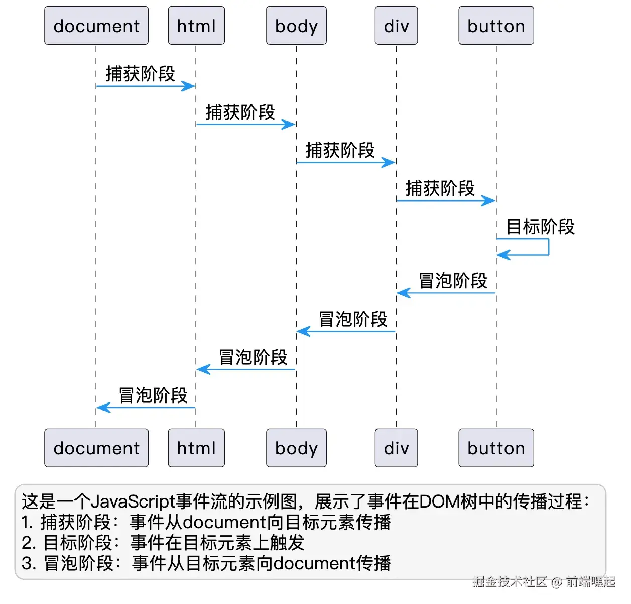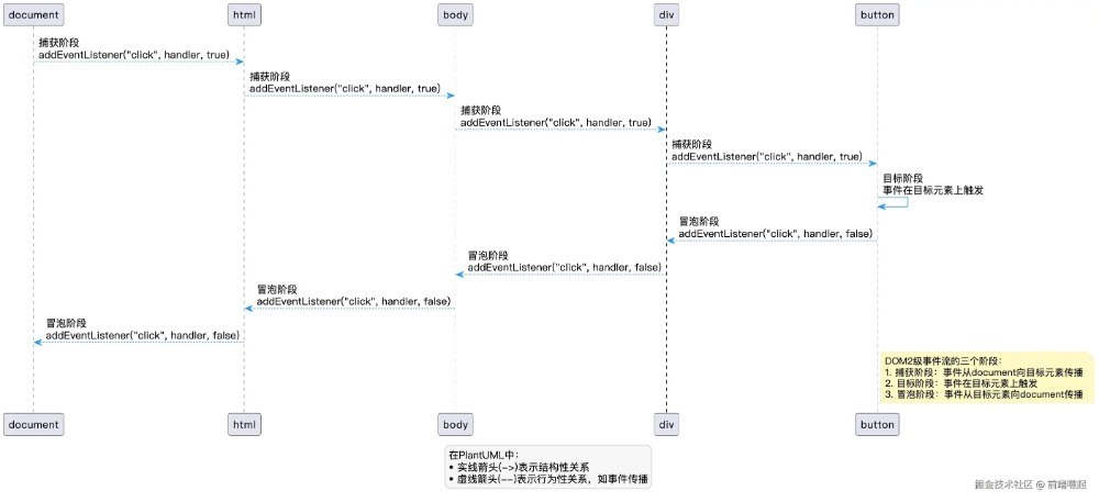 从图中我们可以看到,事件从document对象开始,逐级向下传播到目标元素(捕获阶段),然后在目标元素上触发(目标阶段),最后再逐级向上传播回document对象(冒泡阶段)。