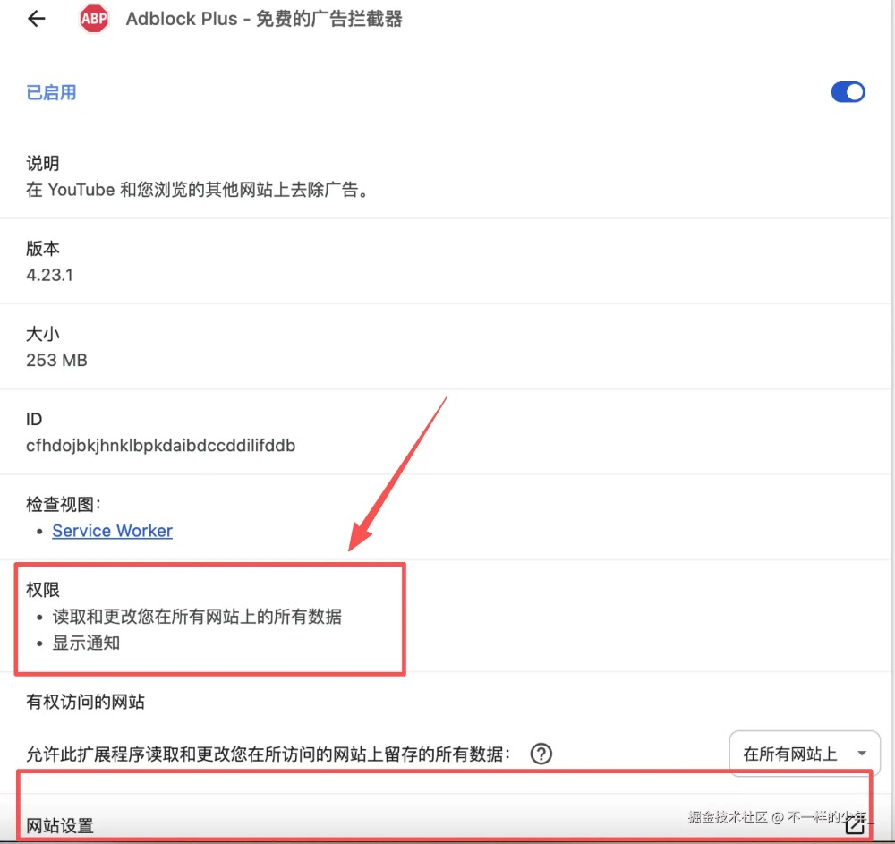 以Adblock Plus为例,这是一个免费的广告拦截器:它的权限可以读取所有网站上的数据