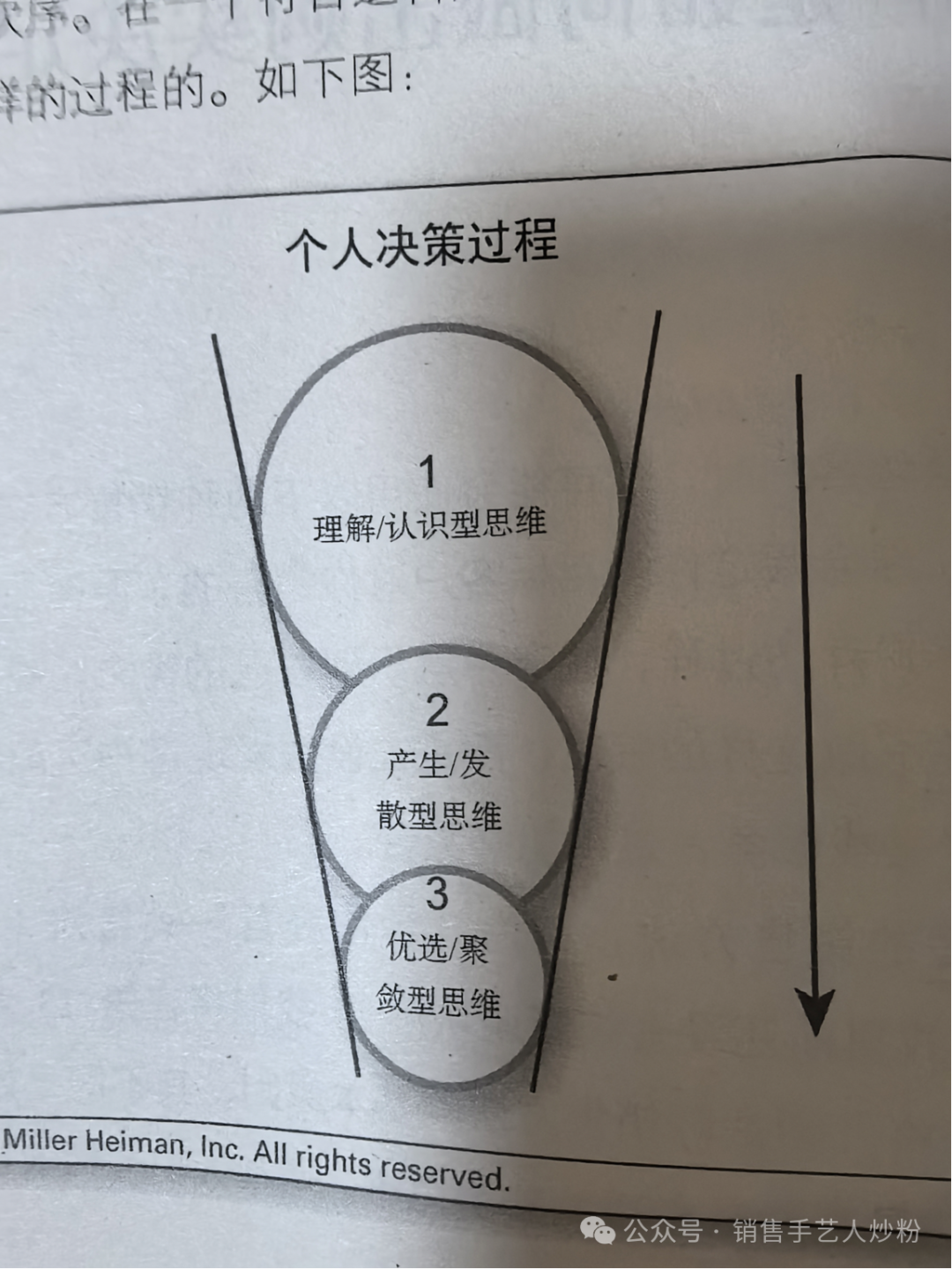 《新概念销售》第二章指出:决策进程按照特定方向运行。在每个完成的决策过程中,认识型思维先开始,发散型思维随后,最后是聚敛型思维。