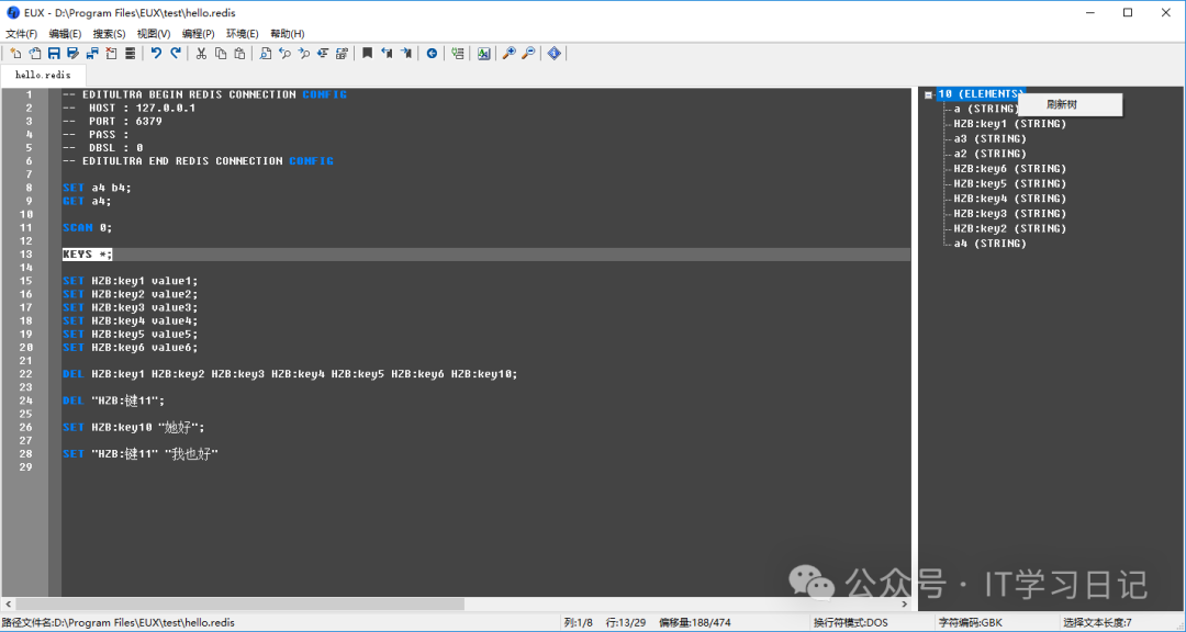 打开.redis文件,根据文件头配置自动连接上Redis服务端,选择Redis命令按F5直接提交执行,查询结果集回显在右方树控件中,还可以按Ctrl+F5自动选择光标所在完整Redis命令语句并执行